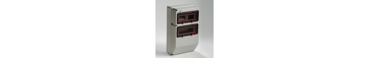 Coffret plastique en ABS équipé de rail Din et volet de protection. Etanchéité de type IP 67 et résistance au choc de niveau IK08 . Il peuvent être équipés de socles de prises en façade . Plusieurs tailles disponibles avec un emplacement pour les protections de 6 à 26 modules .