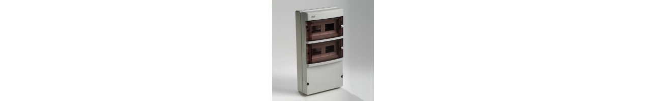 Coffret plastique en ABS équipé de rail Din et volet de protection. Etanchéité de type IP 55 et résistance au choc de niveau IK08 . Il peuvent être équipés de socles de prises en façade . Plusieurs tailles disponibles avec un emplacement pour les protections de 6 à 26 modules .