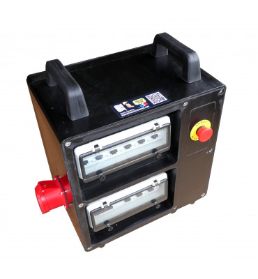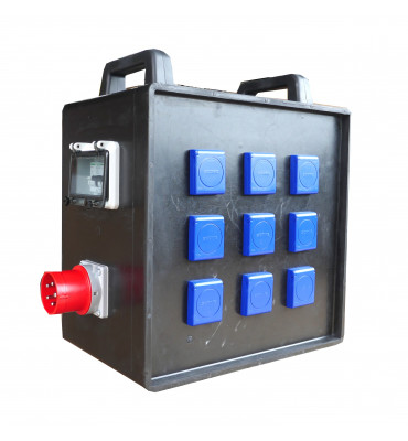 | -enveloppe caoutchouc avec pieds et poignées IP 66 -380x560x350 -1 socle connecteur 32A 3P+N+T -Disjoncteur 4P 32A coupure générale -arrêt d'urgence type coup de poing -9 socles PC 16A P+N+T IP44 std domestique -9 disjoncteurs différentiels P/N 16A 30mA TAC -1 socle PC 32A 3P+N+T -1 disjoncteur + bloc vigi 30mA 3P/N 6kA-C |
